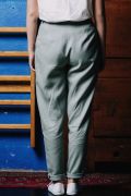 Für unsere Crowdfunding-Kampagne entworfen. Diese silbergraue Hose ist aus feinem europäischen Tencel (Lyocell) gefertigt. Sie können entweder casual oder chic getragen werden. Die Knöpfe sind aus Steinnuss, das Reissverschlussband ist aus Baumwolle und der Faden ist aus Lyocell, so dass dieser Artikel keinen Kunststoff enthält. Dieser Frauenschnitt hat eine hohe Taille.